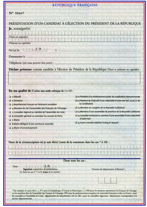 Pour permettre à Alexandre Juving Brunet de se présenter à l'élection préssidentielle de 2027, sa candiature doit recueillir les fameuses "500 signatures". Ces signatures sont en réalité des formulaires de présentation d'un candidat que les élus locaux renvoient au Conseil Constitutionnel. Il est très difficile pour les candidats de réunir 500 soutien lors qu'ils sont peu connus, ou se présentent hors des principaux partis. Si vous pensez que le programme de Alexandre Juving Brunet mérite d'être proposé aux français lors de l'élection présidentielle, prenez rendez-vous avec le maire de votre commune pour lui expliquer pourquoi il doit apporter son soutien à Alexandre Juving Brunet , envoyez ensuite cette page à vos amis et sur les réseaux sociaux. Cela peut vraiment aider plus de candidats pour se présenter et ainsi contribuer au débat démocratique.Pour avoir une idée plus précise, voici ce à quoi ressemble le formulaire que doivent remplir les élus pour soutenir Alexandre Juving Brunet :